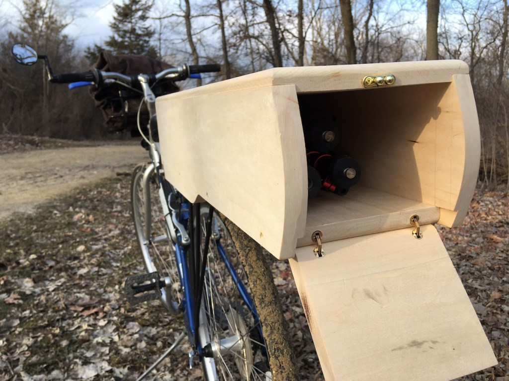 For the quick connect feature I decided to use some woodworker’s aluminum track. Woodworking is a hobby of mine, so I had extra pieces of track around my shop. I made a basic “shelf” for my bike rack out of walnut and mounted the male portion of the track to its sides. I drilled and tapped 3/8”-16 ports into the aluminum track on both sides. My idea was to build a box for the tripod with coordinated pieces of track as part of its undercarriage. This would allow the box to slide onto back of the bike. Once connected, two knobs with 3/8”-16 threads to hold the box in place via the ports I installed.