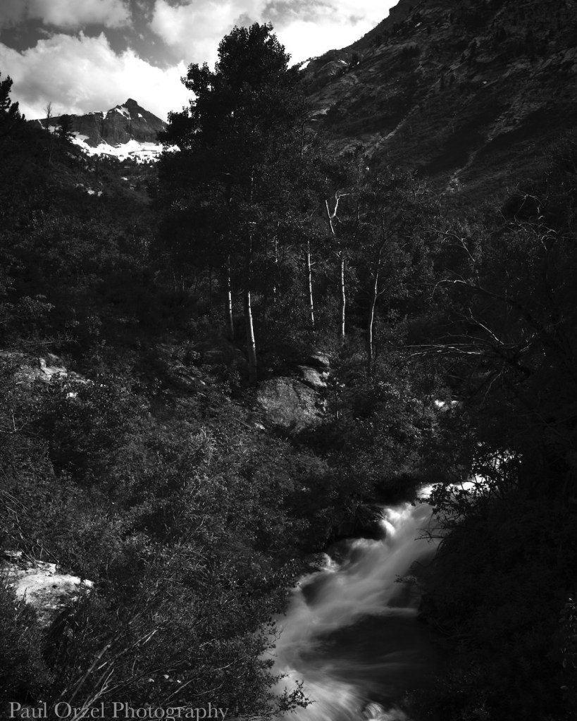 This trail took us into a wide canyon. We proceeded uphill, gaining elevation as our path traced a winding creek. The higher we got, the more snow and ice was among us. All the while, the creek ran wildly over rocks and falls alongside as it made its way the opposite direction. Mountain peaks came in and out of view in the distance. Simply put, we were walking through a fairy tale, and it got better with each step. About 1/3 of the way up I found a great viewpoint for a photograph. It was a bit off the main path, so I mentally marked the area to return. I envisioned a vertical shot in monochrome with a mountain peak in the background (top, left of frame), some aspens in the middle, and the creek running through the lower portion of the frame.