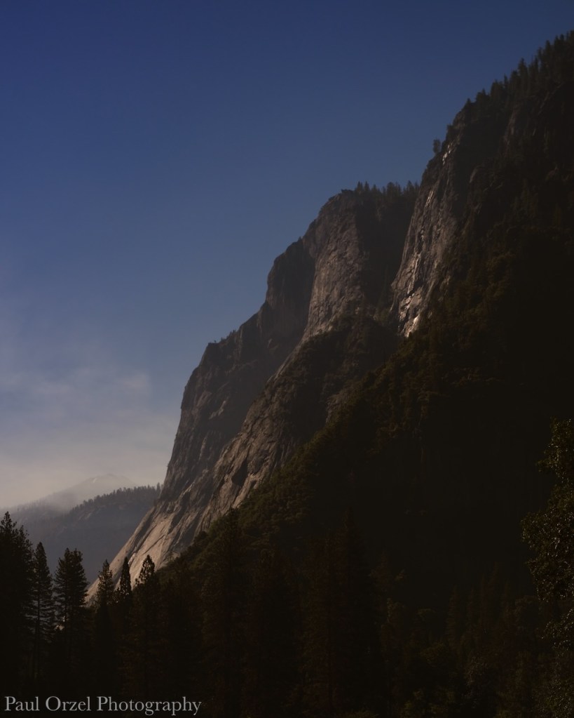 After gawking at the lower falls we walked back a little bit towards where we had started while morning mist and clouds swirled in the sky creating a movement to the early light. It was like a visual symphony playing out all around us and moving with us, and through us. As we proceeded, another scene of immense granite cliffs appealed to me. I set up my camera and watched the movement of the elements (light, clouds, and mist) until the highlights on the cliff face glowed and the sky took on a color that seemed impossible. “Click”!